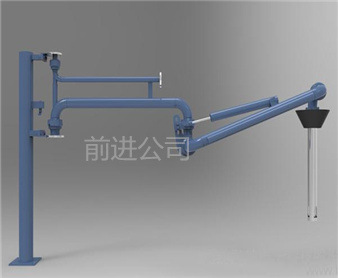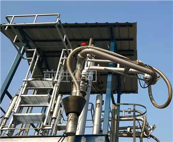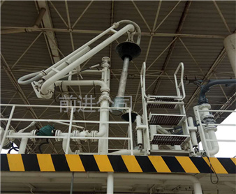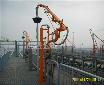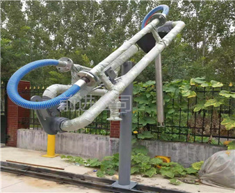 密閉式頂部裝卸臂由5個旋轉接組成回轉**,液相4個,氣相1個。氣相一般為DN50,液相根據(jù)客戶需要的流量選擇。氣相在轉接處使用金屬軟管連接,保證鶴管的旋轉靈活性。鶴管液相接口朝下,氣相接口朝上,一般氣相會多臺匯總在一個主管上,如果單臺排空的話,需要加帶雨帽的阻火器,**管道進入點燃源。垂管上有一個錐形密封帽,裝車時垂管插到槽車的頂部灌口,密封帽壓實在灌口處,鎖緊外臂鎖緊桿(或者氣缸壓緊,在和油氣回收配合使用時,建議鶴管增加氣缸,達到充分密閉的作用,因為空的槽車在裝車時物料逐漸增多,槽車輪胎壓扁,槽車降低,密封帽就不能很好的密封了,必須有氣缸對密封帽有一個壓力,才能使密封帽始終跟緊灌口。達到有效密閉的效果,油氣回收需要密閉效果達到90%-95%)密封帽密閉后,槽車里氣化的介質就能通過鶴管上的氣相管道排空或者抽入油氣回收系統(tǒng)